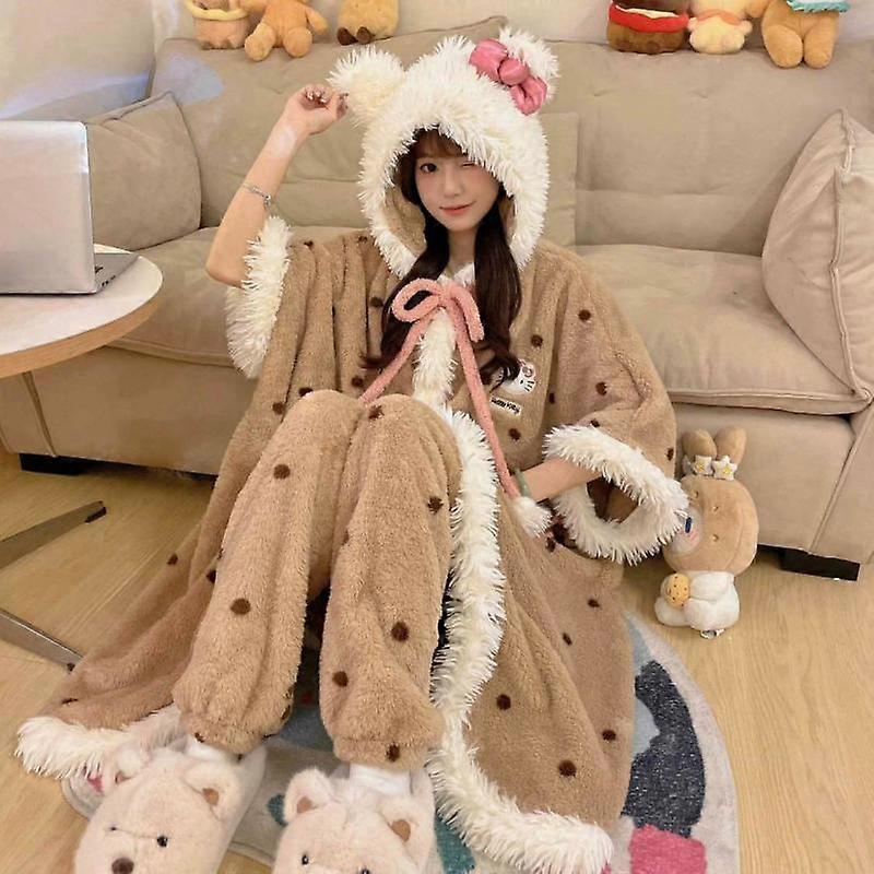 Kawaii Hellokitty Pajamas Nightgown Girls Pajamas Coral Velvet Pants Sanrio Plush Warm Cloak Winter Casual Home Wear Set