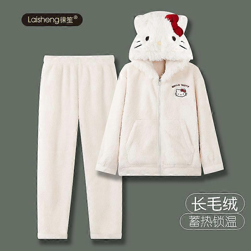 Kawaii Hello Kitty Hooded Pajamas Pajamas 2Pcs Girls Long-Sleeved Tops Pants Warm Loose Flannel Plush Sweet Casual Home Wear Set