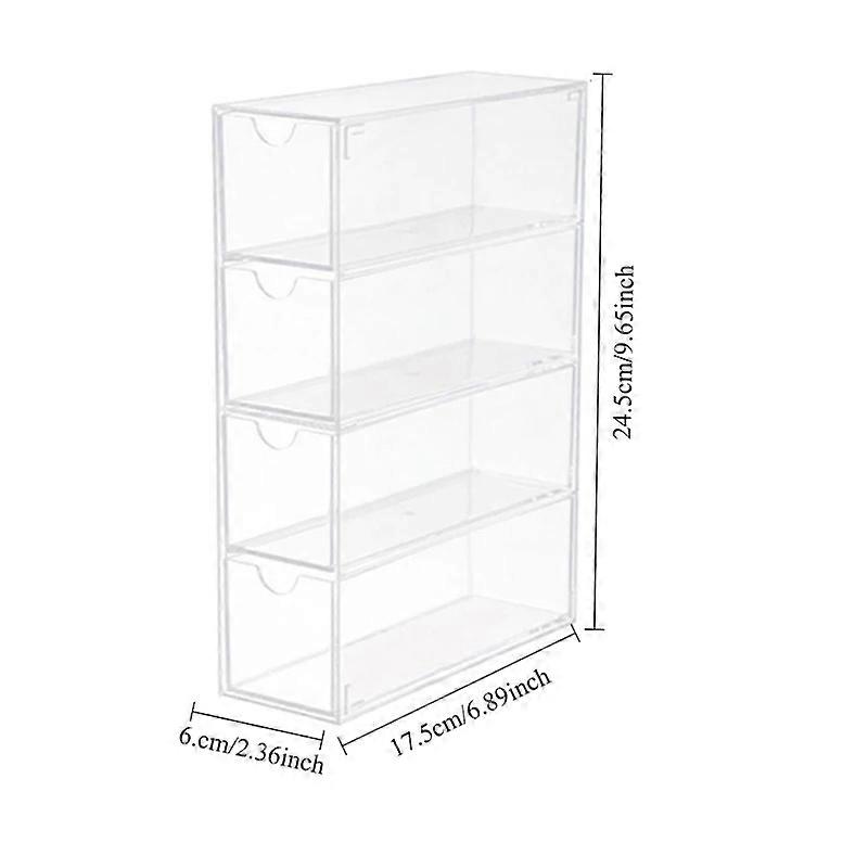 [DETAIL]<br>Clear Acrylic Desktop Drawer Organizer 4 Tier Stackable Storage Box for Sunglasses Stationery Pen Tape Makeup Display Case<br>Dust-proof Desktop Storage Box 4 Layer Acrylic Drawer Organizer for Glasses Jewelry Cosmetic Sunglasses Holder Display Bin<br><br>[ATTRIBUTES]<br>- Function: Stackable<br>- High-concerned chemical: None<br>- Shape: Rectangle<br>- Function: Stackable<br>- High-concerned chemical: None<br>- Shape: Rectangle<br>- Use: Sundries<br>- Technics: Glossy<br>- Style: Modern Style<br>- Material: Acryl<br>- Lattice Quantity: 4<br>- Product: Jewelry Box<br>- Origin: Mainland China<br>- CN: Zhejiang<br>- Type: Storage Boxes & Bins