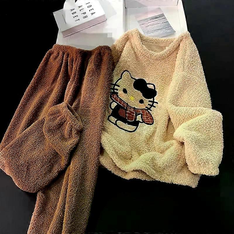 Hot Kawaii Hellokitty Red Pajama Pants Girl Sweet Thickened Coral Velvet LongSleeved Tops Pajama Pants Cute Casual Home Wear Set