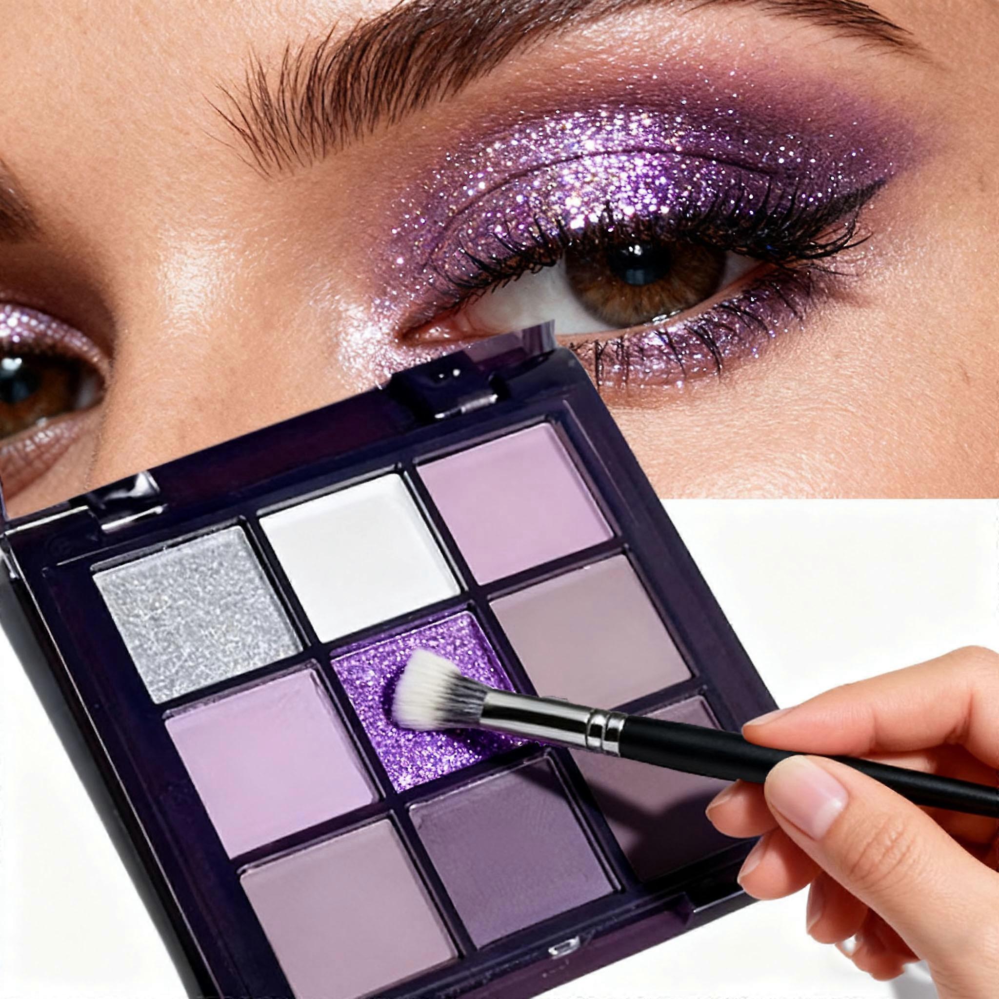 Eyeshadow palette, nine shades of smoky, matte, pearlescent, fine dark purple glitter, affordable makeup