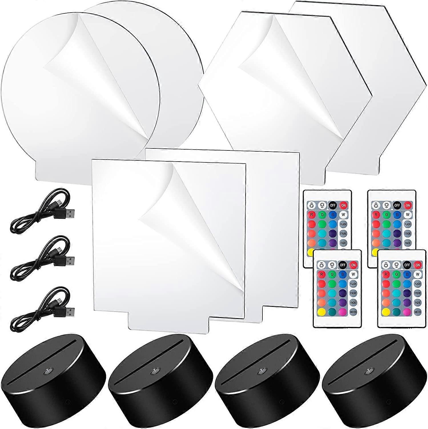 4 Pieces 3D Night LED Light Lamp Bases 6 Pieces Clear Acrylic Sheets LED Display Base Blanks Acrylic with Remote USB Cable