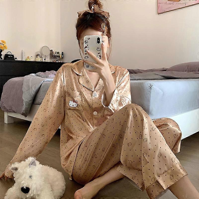 Kawaii Sanrios Hello Kitty Cute Silk Long-Sleeved Pajamas Girl Sweet Nightgown Loose Couple Casual Long-Sleeved Home Clothes Set