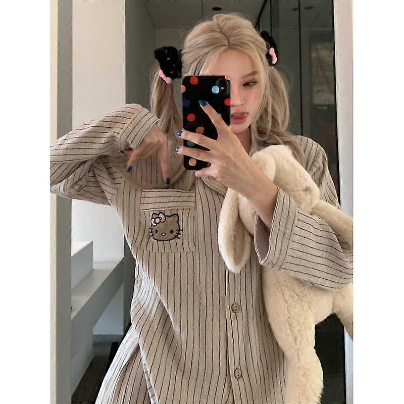 Hot Kawaii Brown Striped Hello Kitty Pajamas and Pajamas Girls Long-Sleeved Tops Ins Sanrio Sweet Cardigan Casual Home Wear Set