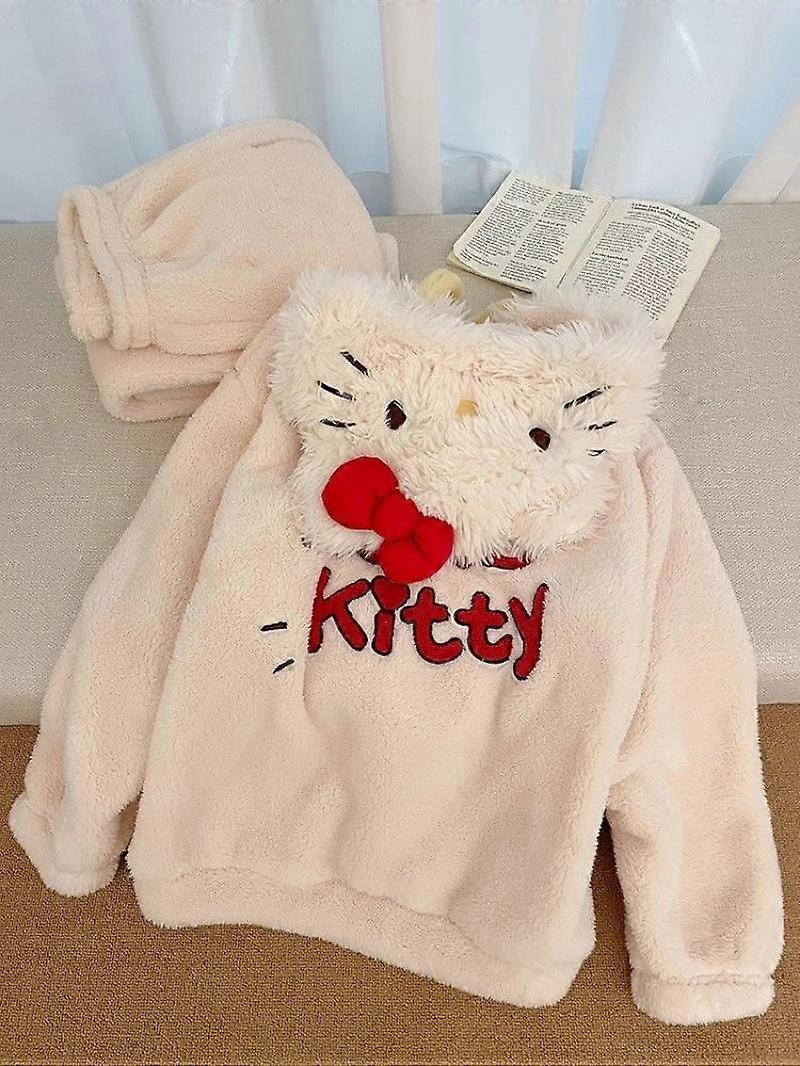 Hot Kawaii Hello Kitty Pajamas 2Pcs Girls Pants Autumn Winter Cute Loose Tops Long Sleeves Plus Velvet Soft Casual Home Wear Set