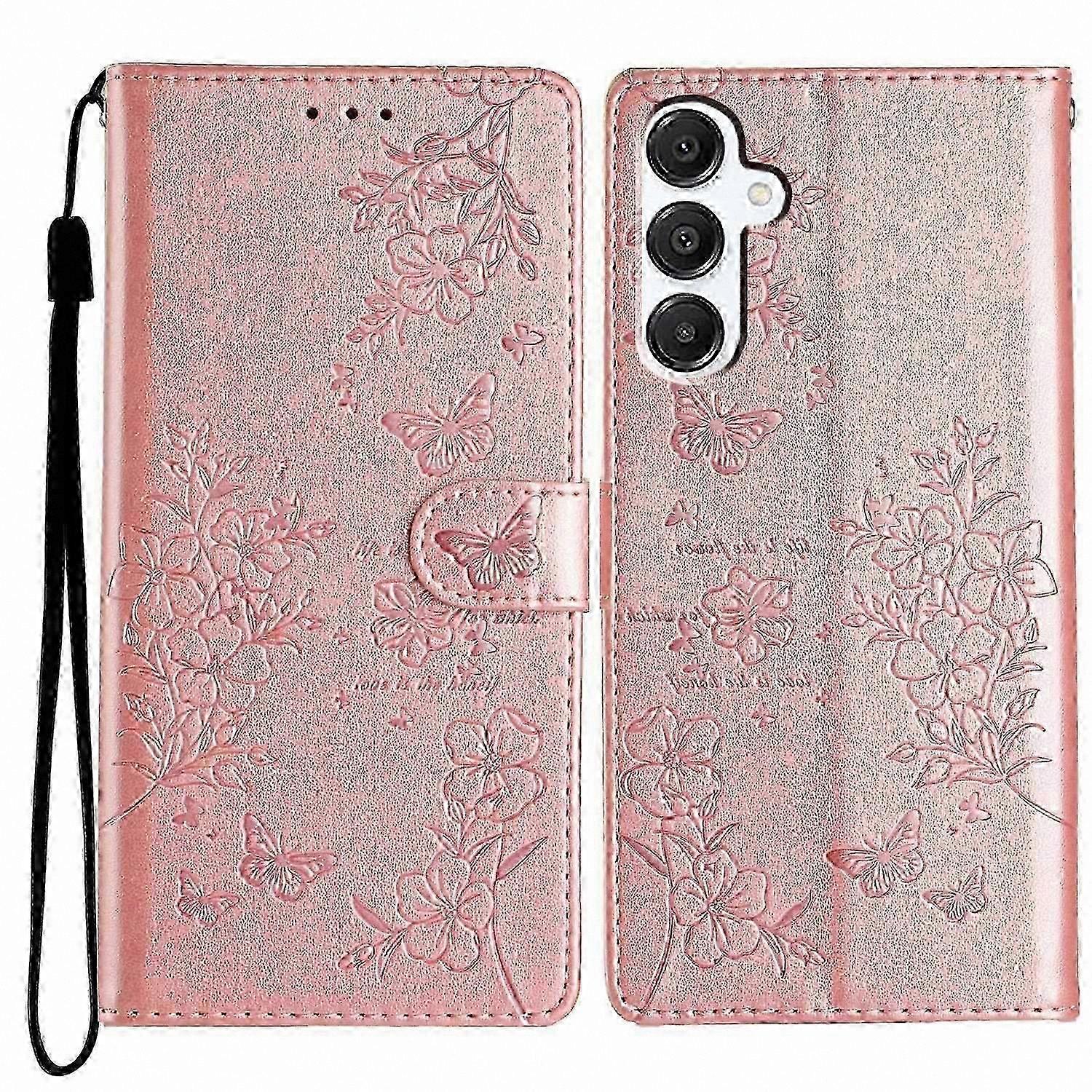 For Samsung Galaxy A26 5G Wallet Phone Case with Butterfly and Floral Imprint – Rose Gold Elegant Imprinted Design: Crafted from PU leather and TPU, the case features a butterfly and floral pattern on the surface for a stylish look. Multifunctional Stand: Built-in stand enables hands-free viewing for videos, reading, or video calls. Card Slots and Wallet: Includes multiple card slots and a wallet compartment for storing cards and cash. Flip Cover with Hand Strap: Flip cover provides full coverage protection with precise cutouts; includes a hand strap for easy carrying. Comprehensive Protection: Precision-fit design safeguards the phone from drops, scratches, and everyday wear. Package includes: 1 x Phone Case, 1 x Hand Strap.