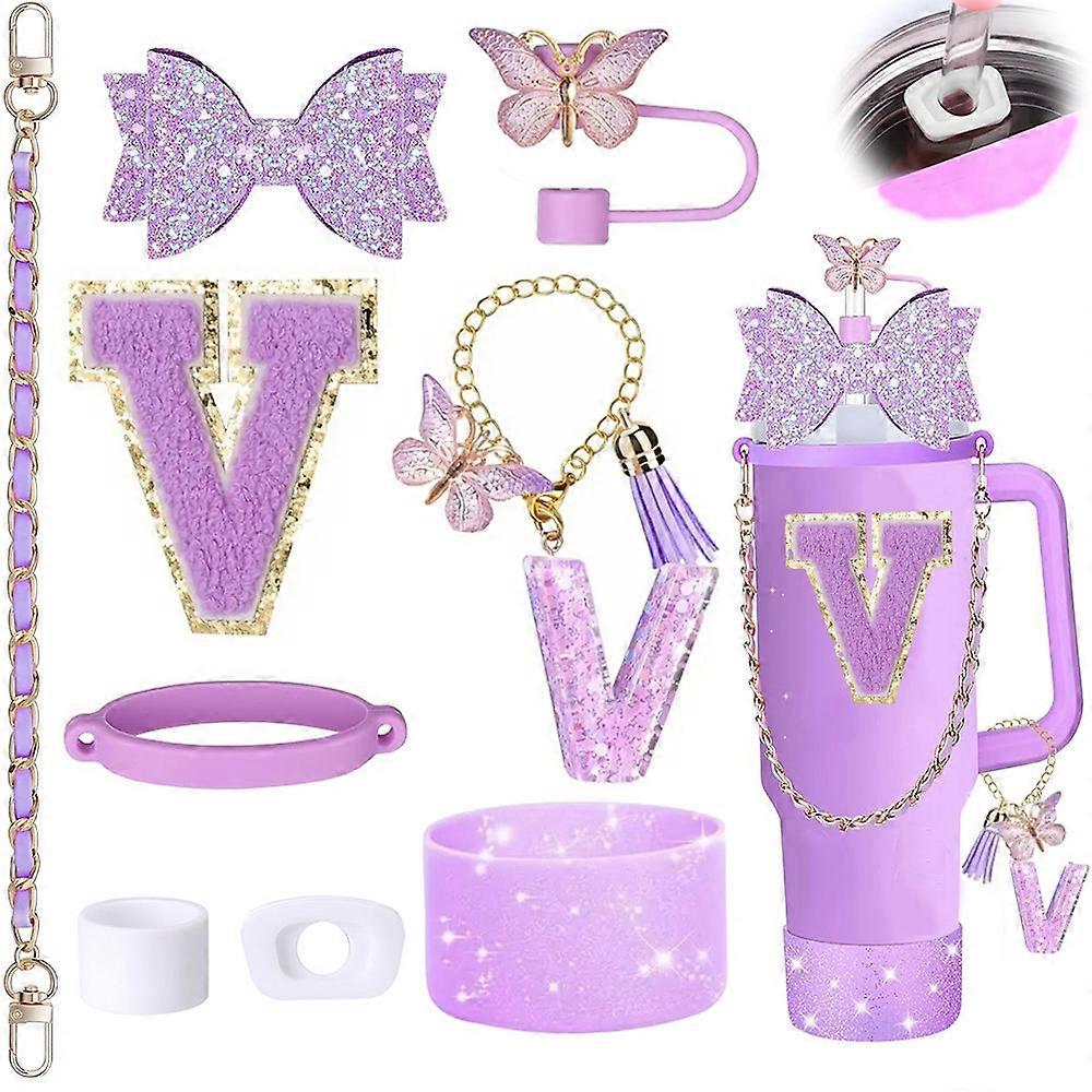 Ensemble de 9 accessoires pour gobelet Stanley : embout de paille, nœud scintillant, embout en silicone pailleté et breloque lettre.