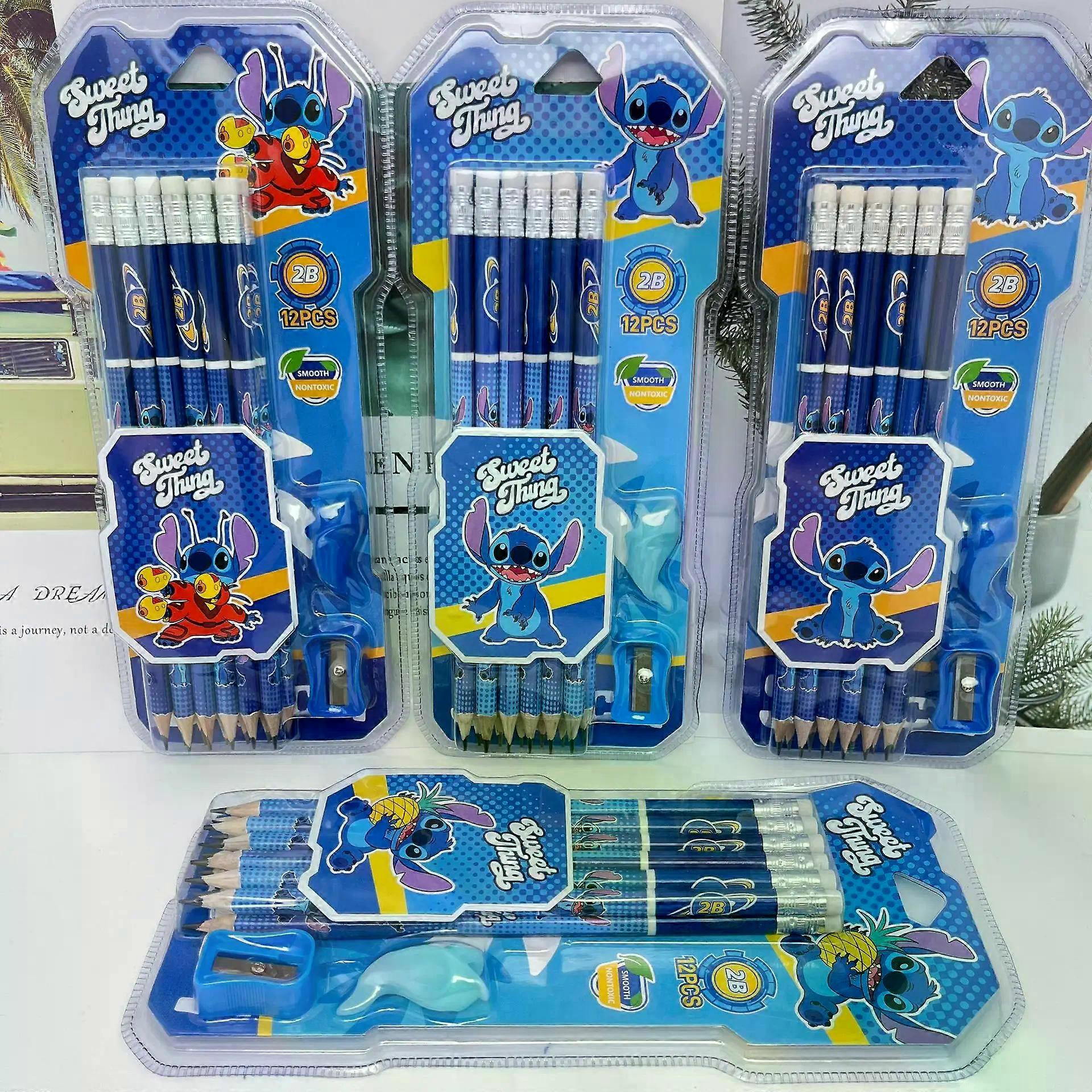 12pcs/Box Disney Stitch Pencil Cartoon Anime Figure HB Pen with Sharpener Eraser Student Stationery School Prize Children Gifts