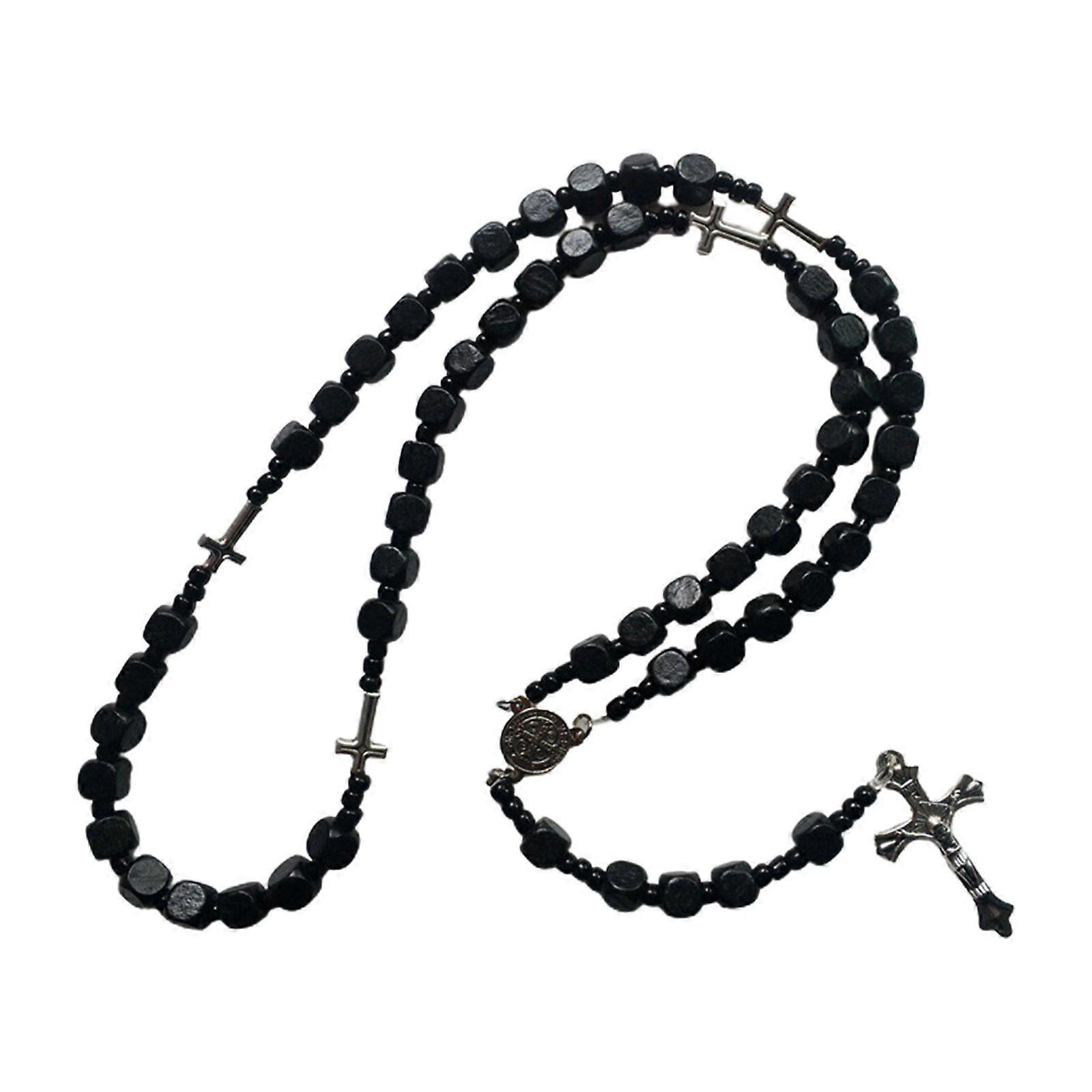 Vintage Wooden Acrylic Beads Rosary Necklace with Jesus Crucifix Cross Pendant Religious Catholic Prayer Gifts for Men Women Jewelry