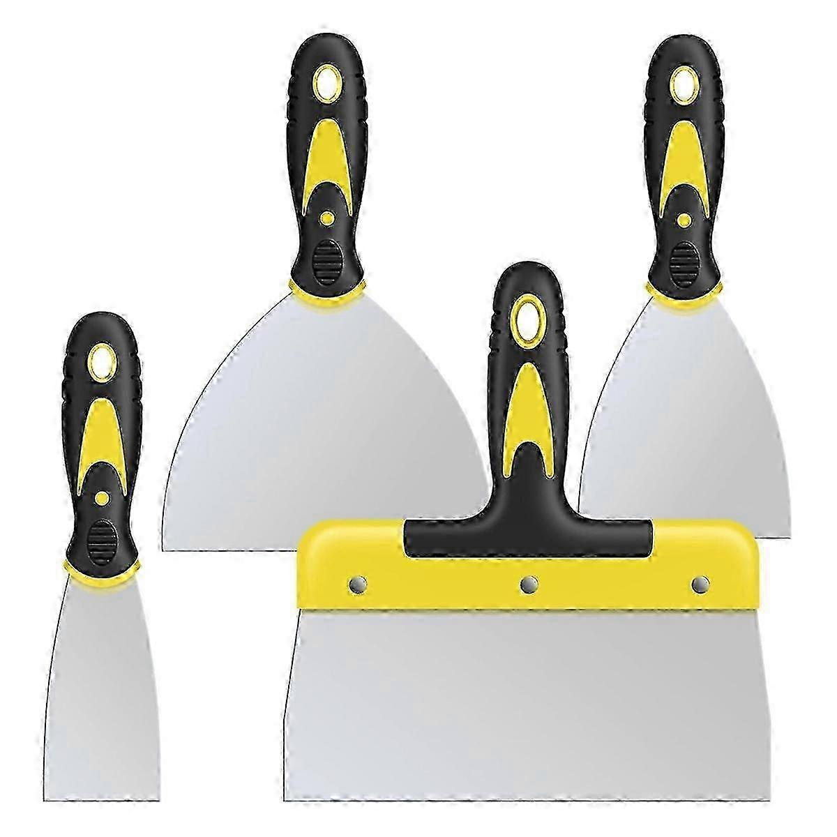 Usage Tips: Stainless Steel: Crafted from stainless steel, our putty knife set boasts high hardness for durability and corrosion resistance. The mirror-polished surface ensures easy cleaning and extended usability, making it a reliable tool for any project. Ergonomic Comfortable Grip: Featuring a plastic material handle with non-slip patterns and finger guide rails, our spackling knife set offers a comfortable and secure grip. The ergonomic design reduces hand fatigue, making it ideal for extensive drywall projects. Versatile Tool Sizes: Equipped with four different sizes (2inch, 4inch, 6inch, and 8inch), our scraper set meets various needs from applying adhesives and drywall tape to putty and plaster. Each size is tailored for specific tasks, enhancing efficiency and precision in home improvement. Innovative Design for Efficiency: The full flex of our putty knives maximize flexibility for precise, smooth finishes. The convenient hanging hole design allows for easy storage on nails or pegboards, optimizing space in your work area. Multi-Functional Uses: Ideal for a range of tasks including applying putty, scraping paint, removing wall coverings, and patching up dents and cracks in plaster. This versatile set is also perfect for tasks involving wallpaper, applique, and more, making it a must-have for any toolkit. Colour:BlackandYellow Material:Stainless steel and plastic Package Contents: 1 x Widened putty shovel 8inch 3 x Two-color handle putty knife(2inch, 4inch, 6inch) Only the above package content, other products are not included. Note: Light reflection and different displays may cause the color of the item in the picture a little different from the real thing. The measurement allowed error is 1-3cm.