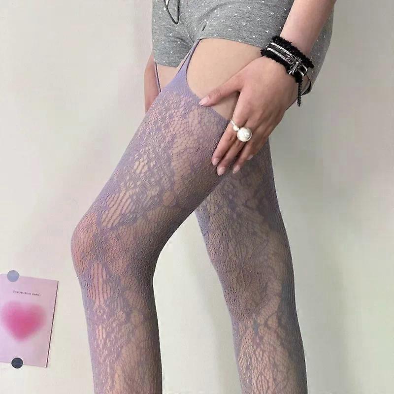 One Size;White-New Women's Purple Floral Lace Stockings with Garter, Sexy Japanese Sheer Mesh High Stockings, Polyester JK