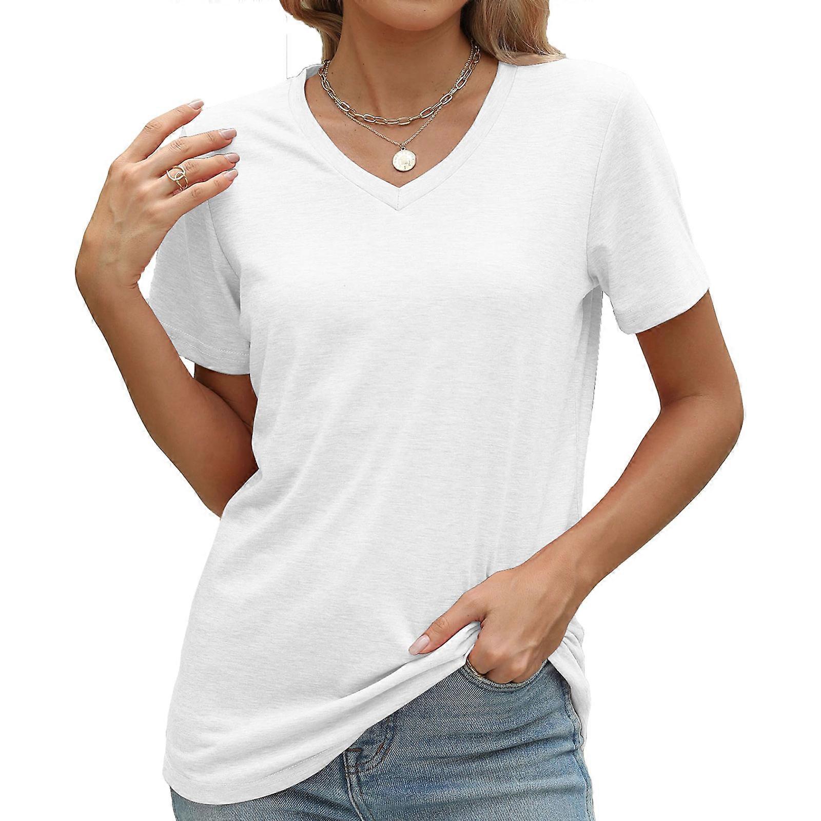 Women's V-neck T-shirt, summer short-sleeved top, casual solid color T-shirt, soft basic T-shirt White XL
