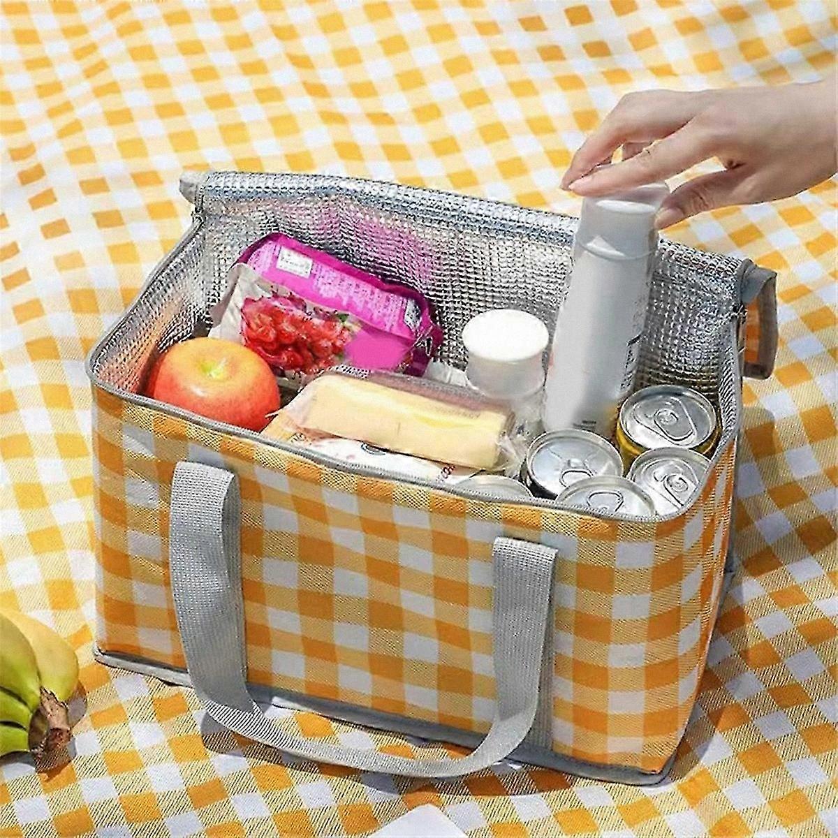 Foldable Insulated Cooler Bag - Thermal Picnic Bag for Food & Drinks Storage | Gingham Pattern, Yellow, Zippered Top