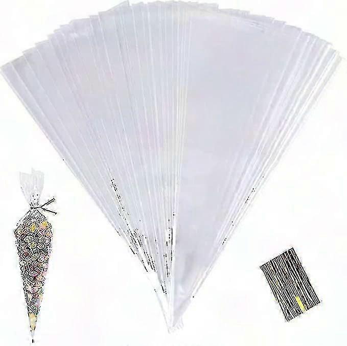 100pcs Clear Cellophane Cone Bags - Large Triangle Plastic Sweet Bags for Treats & Favours. Meat: 25x13cm, Includes Twist Ties, Food-Grade. Closer: Pe