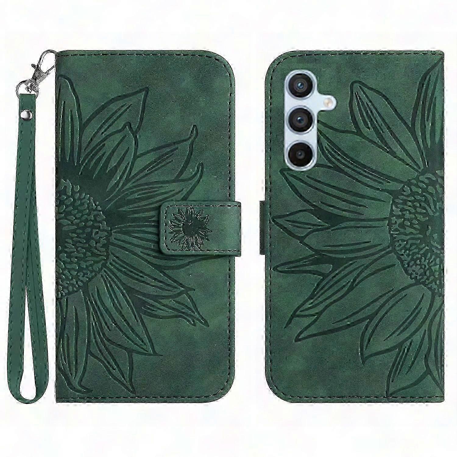 Galaxy A16 5G Wallet Case - Sunflower Emed Faux Leather Phone Cover, Green - Flip Protective Shell with Cards Slots & Wrist Strap