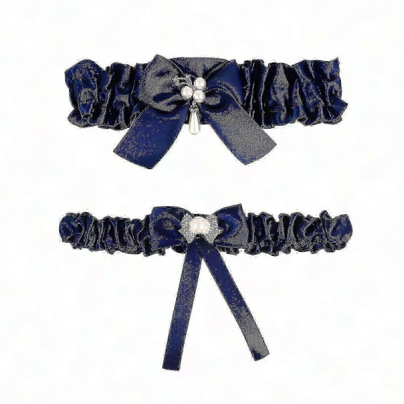 Elegant 2pcs Wedding Garter Belt Set for Bride - Navy Blue Lace Leg Garters with Bow & Pearl Detail - Classic Bridal Thigh Band Gift Accessory