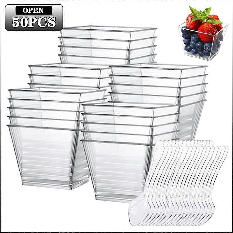 50PCS 2/4OZ Plastic Dessert Cups with Spoons Clear Mini Square Tumbler Cups for Mousse Pudding Appetizer Party Supplies