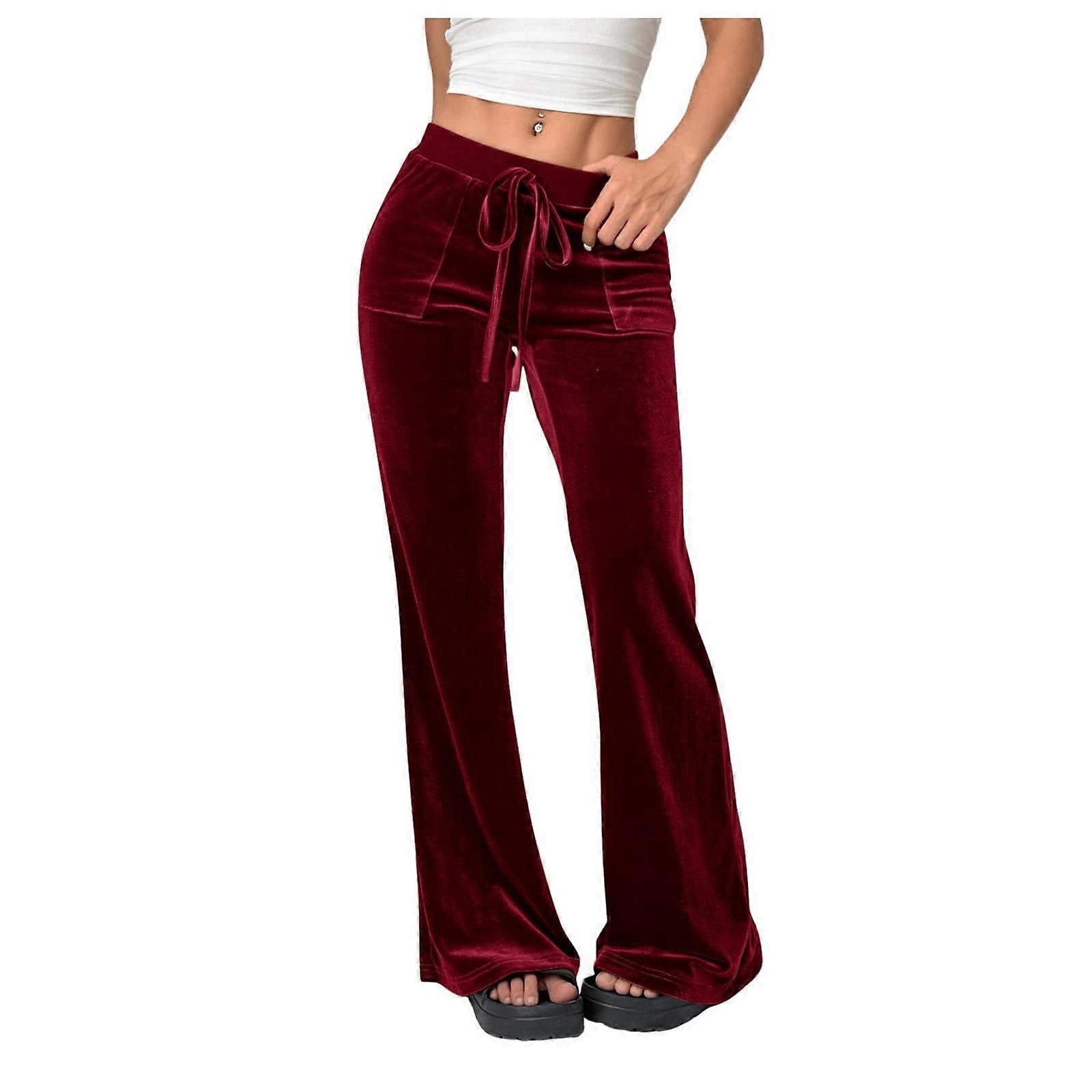 Women's Stretch Velvet Flared Pants Retro Drawstring Waist Long Palazzo Trousers with Pockets for Casual and Formal Wear Burgundy XL