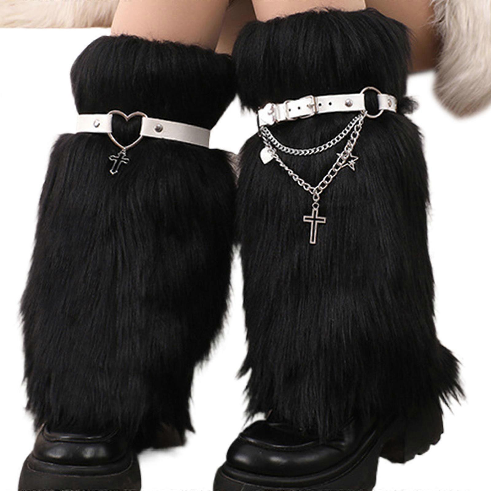 Fuzzy Boot Cuffs Leg Warmer for Women Harajuku Gothic Furry Plush Leg Cover Leg Gaiter with Heart Chain Garter Belt Set Black and White