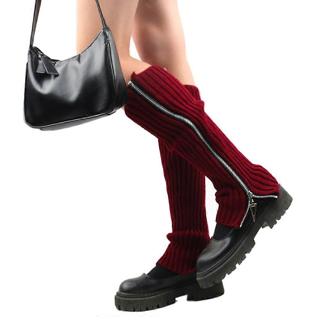 Women Punk Ribbed Knit Leg Warmers Harajuku Side Zipper Solid Color Boot Socks Burgundy