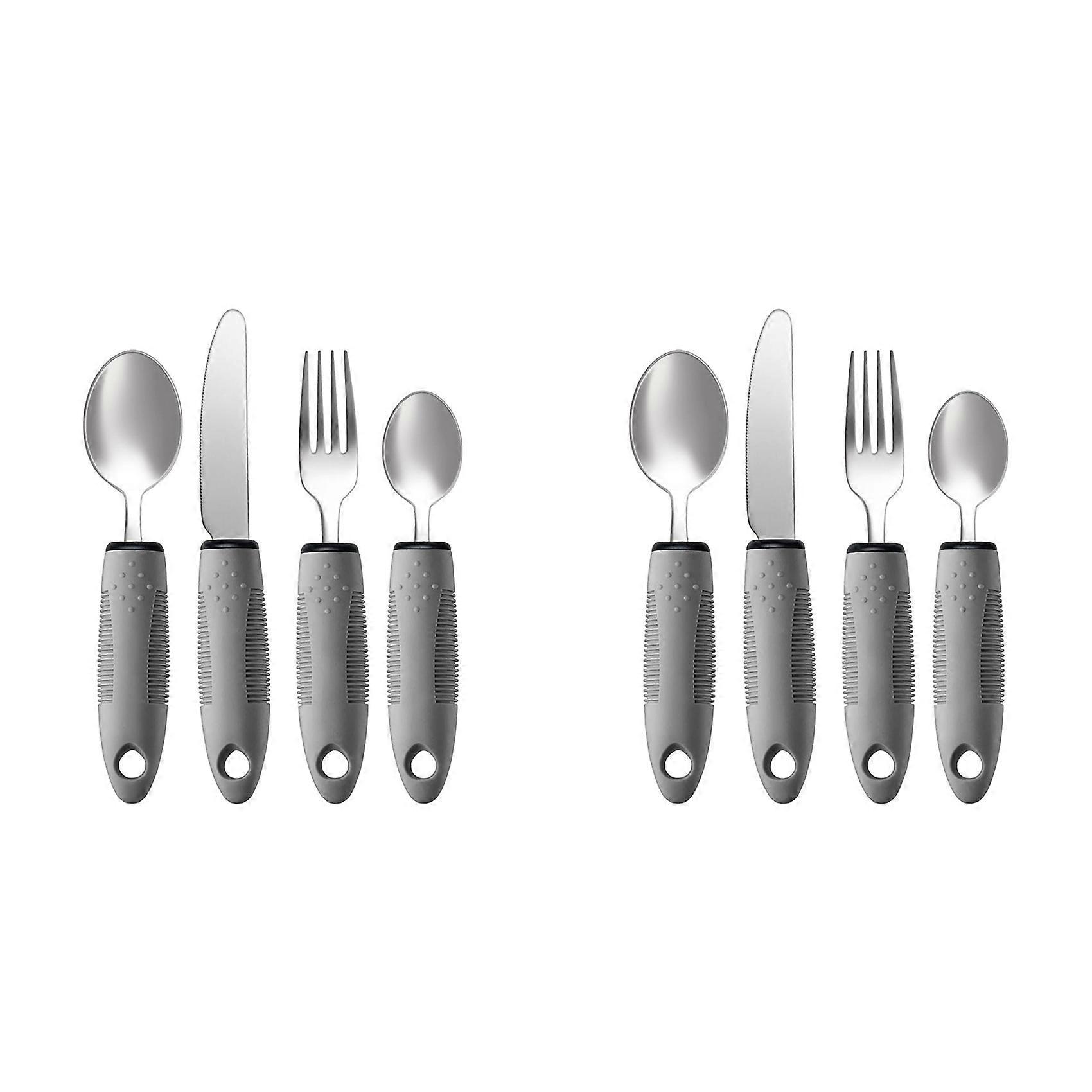 ENHANCED INDEPENDENCE AT MEALTIME: Experience increased autonomy during meals with Adaptive Utensils. This set is specifically designed for those with hand tremors, arthritis, or weak grips due to Parkinson's disease, ensuring a steadier hold for a more enjoyable dining experience. COMFORTABLE AND SECURE GRIP: Each utensil in this 4-piece set features an enlarged, easy-grip handle that is thoughtfully contoured to fit comfortably in your hand. Built to enhance stability and control, these utensils make dining easier for adults with mobility challenges. SUPERIOR DURABILITY AND HYGIENE: Crafted from premium, rustproof stainless steel, the adaptive utensils promise long-lasting use and resilience. Plus, they're dishwasher safe, offering an effortless cleanup post meals, allowing you more time to enjoy other activities. FULL SET FOR ALL MEAL NEEDS: Our adaptive utensil set includes a tablespoon, teaspoon, knife, and fork, catering to various dining needs. Whether it's a hearty soup or a steak dinner, this versatile set has you covered, promoting independence and satisfaction at every meal. Note: Slight color difference or differences in kind, does not affect the use of Colour:Gray Material:Stainless Steel+TPR+PP Package Contents: 8x adaptive cutlery set Only the above package content, other products are not included. Note: Light reflection and different displays may cause the color of the item in the picture a little different from the real thing. The measurement allowed error is +/- 1-3cm.