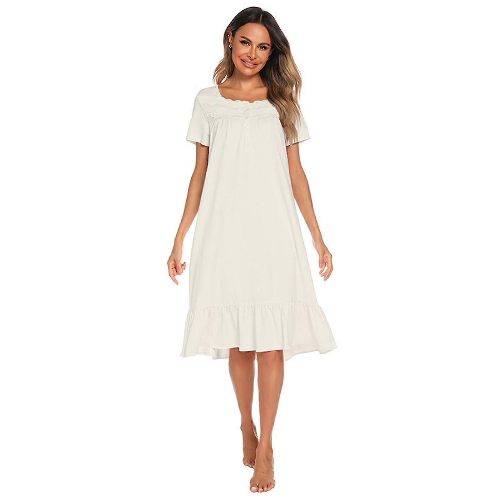 Women's Romantics Sleep Dress with Lace Trim Princess Design Short Sleeve Square Neck Button Nightgown for Lounging White XL