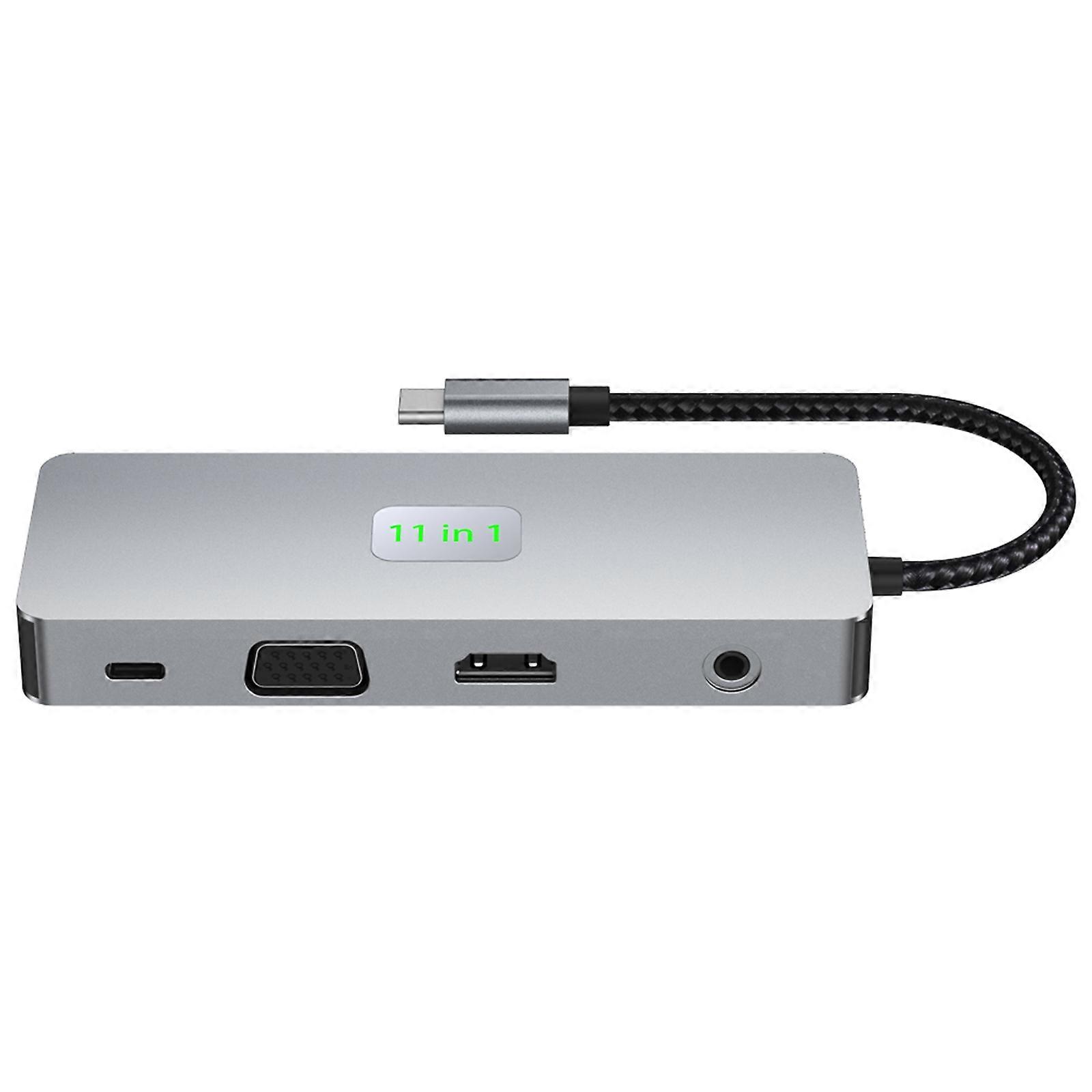 Features: This 11 in 1 USB C Hub expands your connectivity with HDTV 4K@60Hz, VGA 1080P two display, Gigabit Ethernet, card slots, three USB3.0 port, PD100W charging, and 3.5mm sound, offering comprehensive port solution for modern devices. from aluminum with braided cable, the hub features plug and play functionality and broad for systems, eliminating the need for additional driver. for photographers transferring card content, designers requiring two screen setups, and business professional needing Ethernet connectivity and multiple USB peripherals simultaneously. for conference room presentations, home office workstations, or remote setups where stable networking access, multi monitor productivity, and fast data transfers are essential for efficient task management. Its form factor makes this adapter an indispensable travel companion, seamlessly integrating into your digital lifestyles whether you're working from cafes or collaborating in co working spaces. Specifications: Materials: Aluminum alloy, PCB, braided wire Product size: 125x45x15mm, line length: 13.5cm Product weight: 98g Color: silver gray Plugs type: USB Type C plugs Interfaces type: HDTV, VGA, RJ45, card slot, USBA3.0, USB C, PD100W fast charging, 3.5mm Theoretical transmission rate: 5Gbps Package Includes: 1PC 11 in 1 USB C Docking Station note: Please allow 0-1cm error due to manual measurement. make sure you not mind before bid. Due to the differences between different monitors, the Pictures may not reflect the actual of the item.