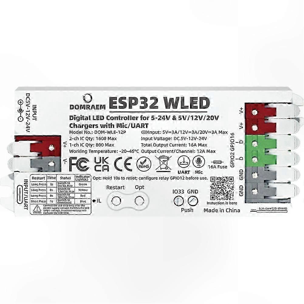 ESP32 WLED Digital LED Controller with Mic/UART 16A Fuse for WS281X SK6812 APA102 Strips