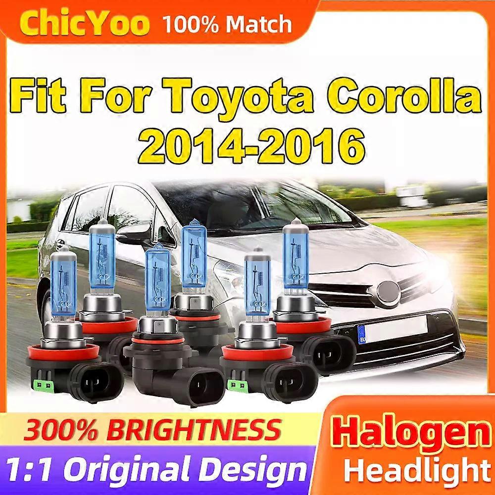 Specifications High-concerned chemical:None Wattage:100W Voltage:12 V Brand Name:ChicYoo Origin:Mainland China Certification:CE,FCC,RoHS Low Beam Headlight Bulbs:High beam headlight bulbs Halogen Bulbs:Super White Halogen Headlights Halogen Headlight Bulbs:Halogen Headlamps Canbus No Error Halogen Headlights:Halogen Lights Car Halogen Lights:Super Bright Halogen Lamps Auto Halogen Headlamps:6500K Super White Halogen Lights 360 Degree Lighting Halogen Lamps:Plug And Play Halogen Lights Car Halogen Headlights:High Power Halogen Lights Voltage: 9-32V(Fit 12V/24V) Lumens : 36000LM/3Pair Power : 300W/3Pair Color Temperature:6500K( Super White ) Lifespan: >10000hrs Waterproof : IP 68 Working Temperature:-40 - +85℃ Warranty: Yes Light Source:Halogen Usage:front headlight Suitable Models: Fit For Toyota Corolla 2014 2015 2016 Features: 【Plug and Play】: Almost 1:1 same size design as old halogen bulb ,Installation takes just 5-10 minutes, and the built-in driver saves space, without external drivers or additional wires. 【900% Brighter/Power Saving】 The headlight bulbs are 3 times brighter than original bulbs ,100w per bulb, 6500k white perfect beam. Halogen light bulbs with new chips, luminous flux up to 12000 lumens/bulb. 【Longevity Beyond 10,000 Hours】The low and high beam Halogen Bulb is filhalogen with Xenon gas, which helps helps to slow down the process of oxidizing the tungsten inside. Halogen bulbs lifespan can reach more than 10,000 hours . Package: 6 Pieces Bulbs(High Low  Fog) 4 Pieces Bulbs(High Low Beam) 2 Pieces Bulbs(High Beam) 2 Pieces Bulbs(Low Beam) 2 Pieces Bulbs(Fog Lights)