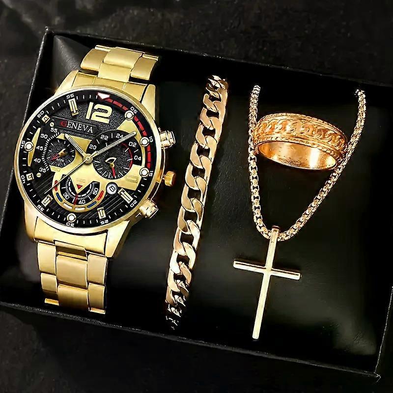 4Pcs/set Luxury Men Business Quartz Watch stainless steel Roman Calendar Wrist Watch Cross Necklace Bracelet Ring Set Men's Gift