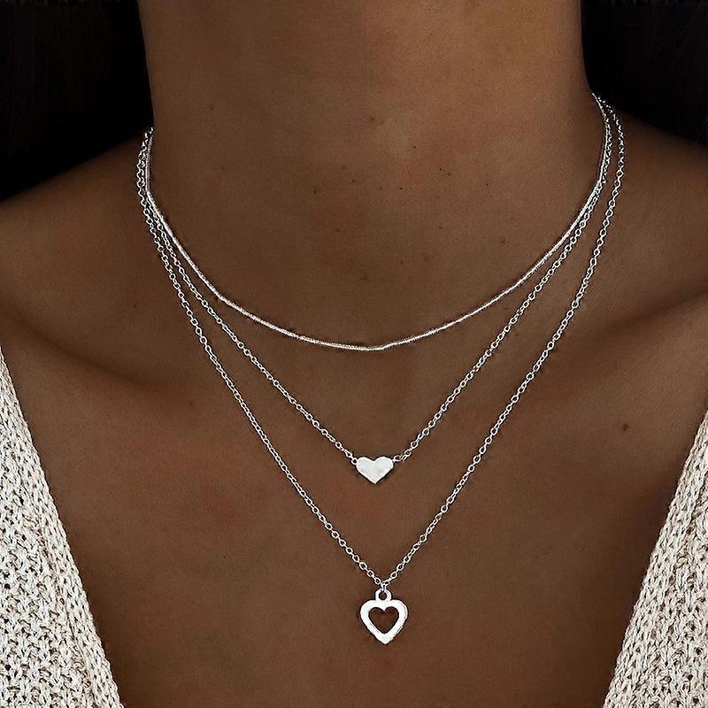 Silver Color Double Love Pendant Multi-layer Necklace For Women Three-piece Set Fashion Daily Accessory Jewelry Birthday Gifts