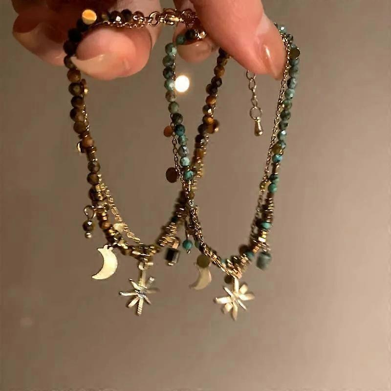 Natural Stone Double Layered Beads Vintage Bracelets for Women Fashion Metal Mang Star Pendant Bracelets Y2K Charm Jewelry Gifts