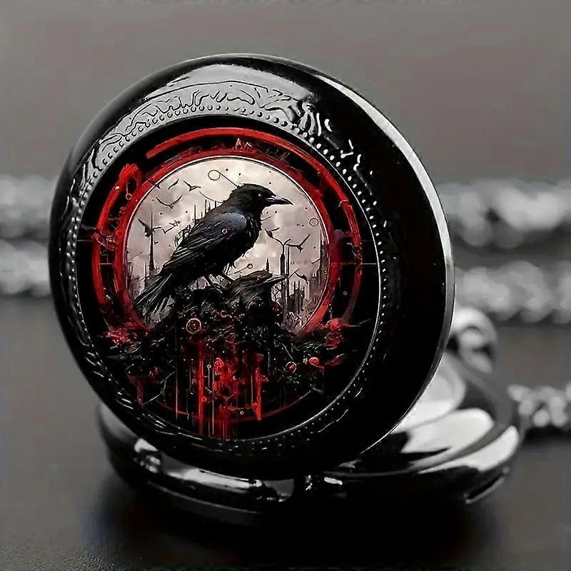 Gothic Design Black Raven Pocket Watch With Necklace Alloy Case & Band,Quartz Movement, Non-Waterproof Watch for Men Women Kids