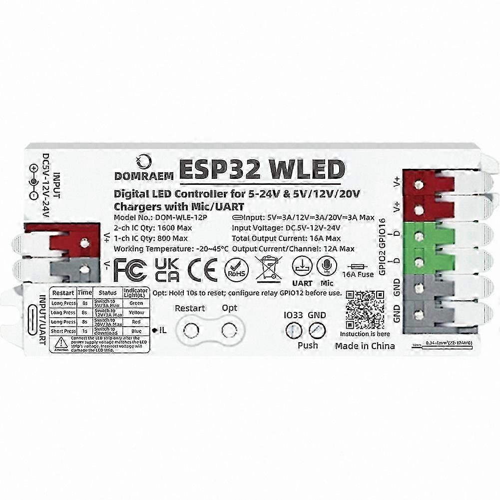 Ultra-fast PD charging: Supports Type-C PD 3.0 (5V/3A, 12V/3A, 20V/3A). Easily test and set up with just a simple power bank! Wide voltage support: Compatible with 5V, 12V, and 24V light strips (24V PD mode is ideal for low-density layouts). Dual DC power supply: Two independent 5-24V inputs with easy-to-connect terminals handle up to 16A, making it easy to light up even long light strips. Comprehensive power flexibility: Switch between PD and DC modes at will. Over 100 lighting effects and intelligent control Pre-installed WLED: Comes with over 100 built-in lighting effects (rainbow, breathing, music sync). Manage your lights over your local network or the internet via the mobile app and web interface. Split a single LED strip into separate segments to create unique lighting combinations. Equipped with a high-sensitivity microphone for real-time music syncing. Wide compatibility: Fully supports mainstream digital LEDs such as WS2812B, SK6812, APA102, covering dimming, color temperature, RGB, RGBW and RGBCCT types. Microphone type: Universal 12S PpM (2). 12S SD pins: 26 (3). 12S WS pins: 21 Color: White Material: ABS Package Contents: 1 * Digital LED Controller