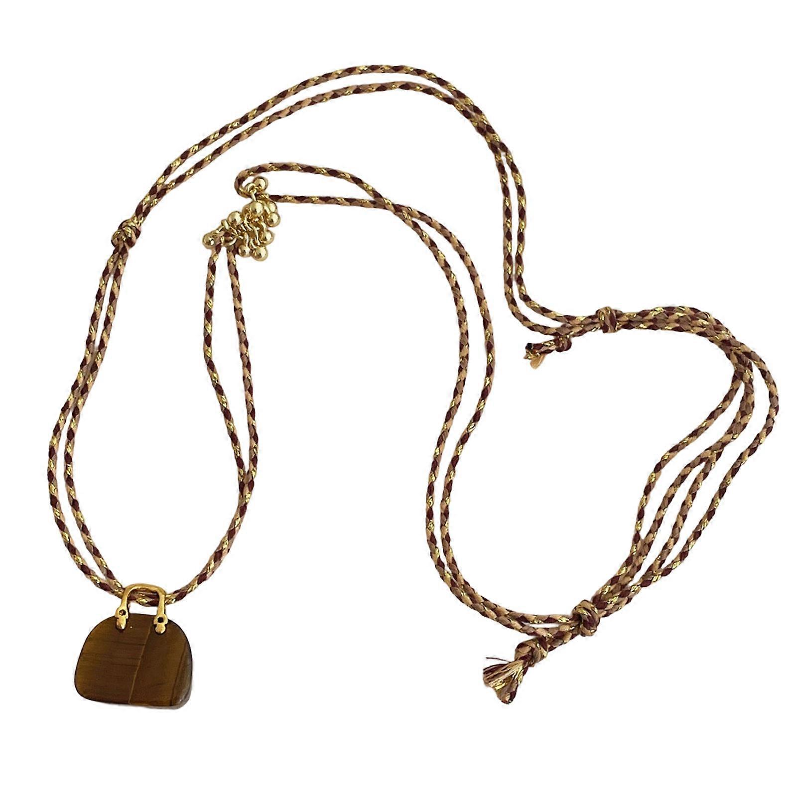 Lightweight Comfort Fit Bohemian Inspired Woven Rope Bag Necklace Natural Tigers Eye Stone Pendant Fashion Accessory for Women Multicolor