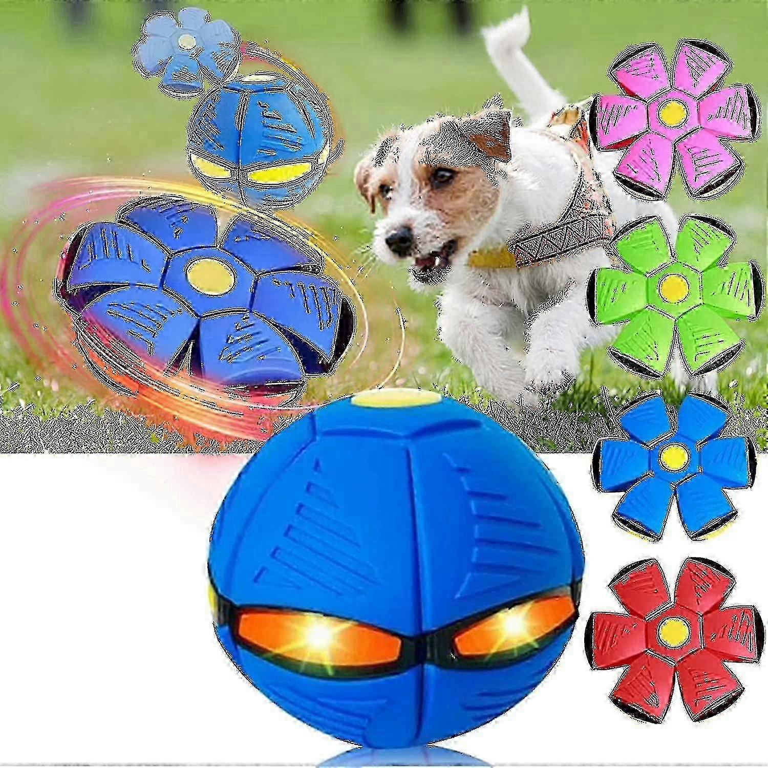 Pet Toy Flying Saucer Ball - This stomp ball is cool and kinetic, with a lighting sense, the night can also be happy to play, by external force when there are colorful lights, press, and catch the ball more coolly.Two Forms - The flying saucer ball dog toy after pressing a flying saucer, press the yellow circle with the palm of your hand, directly up and down to fit the suction, free to switch.Strong Elasticity - pet flying saucer ball is easy to operate, elastic jump extremely high, plays a variety of ways, and has light changes.Good Material - pet toy flying saucer ball is environmentally friendly ABS material, soft rubber material, and not easy to damage.A Variety of Colors - This pet toy flying saucer is colorful, in diverse styles to meet your preference for color, red, blue, purple, and green four colors corresponding to four luminous models. Note: The product may have a slight tolerance of 1-3 mm/1-3 g in size/weight, and the image color may differ from the actual item due to lighting.