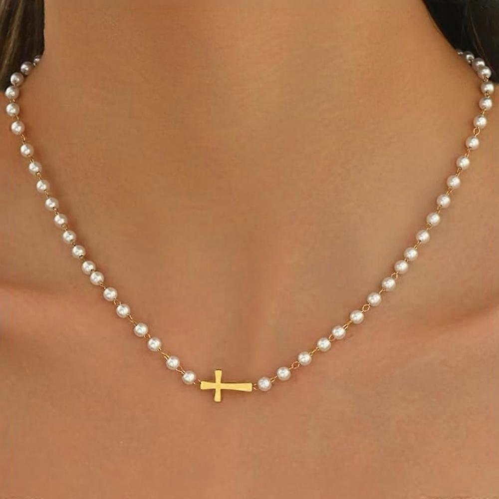 MEDFOLY 14K Gold Plated Cross Necklace for Women Anti Allergic Small Cross Pendant Pearl ChainTrendy Faith Jewelry Gift