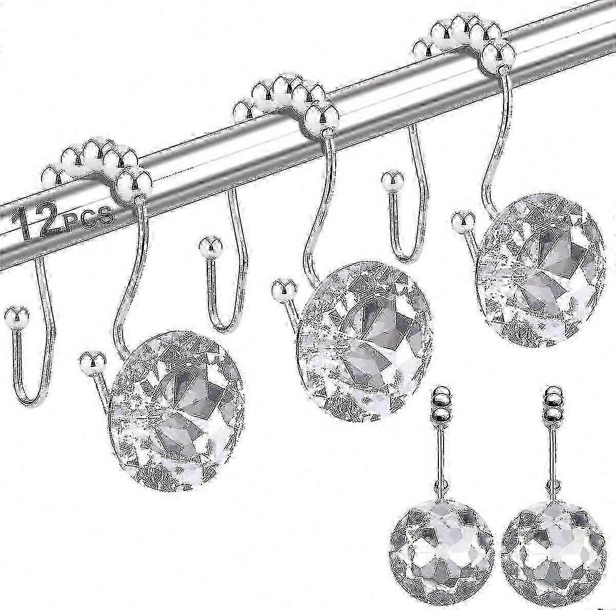 12 Pack Crystal Rhinestone Shower Hooks, Double Glide Anti-Rust Rings for Bathroom Curtains and Liners