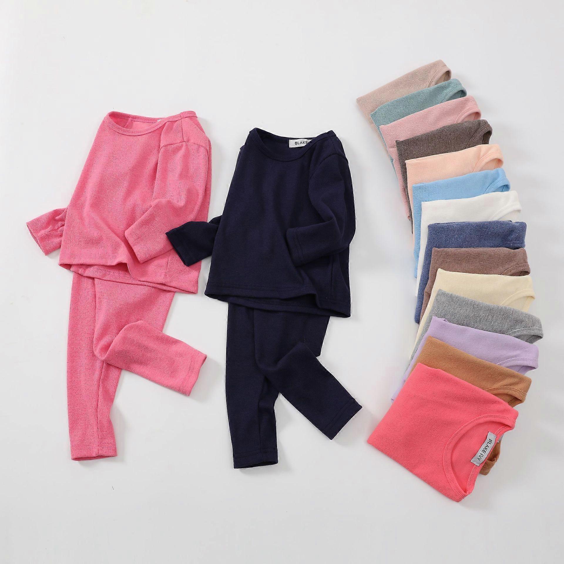 2Pcs Solid Ribbed Knitting Boys Girls Pyjamas Sets Kids Pajamas Pullover+Pants Cotton Clothes Long Sleepwear Tracksuit Costume