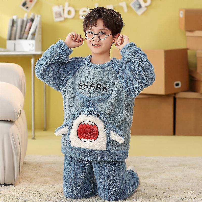 Thickened Warm Flannel Kids Sleepwear Loungewear Pullover Suit Winter Cute Cartoon Shark Boys Girls Pajamas Homewear