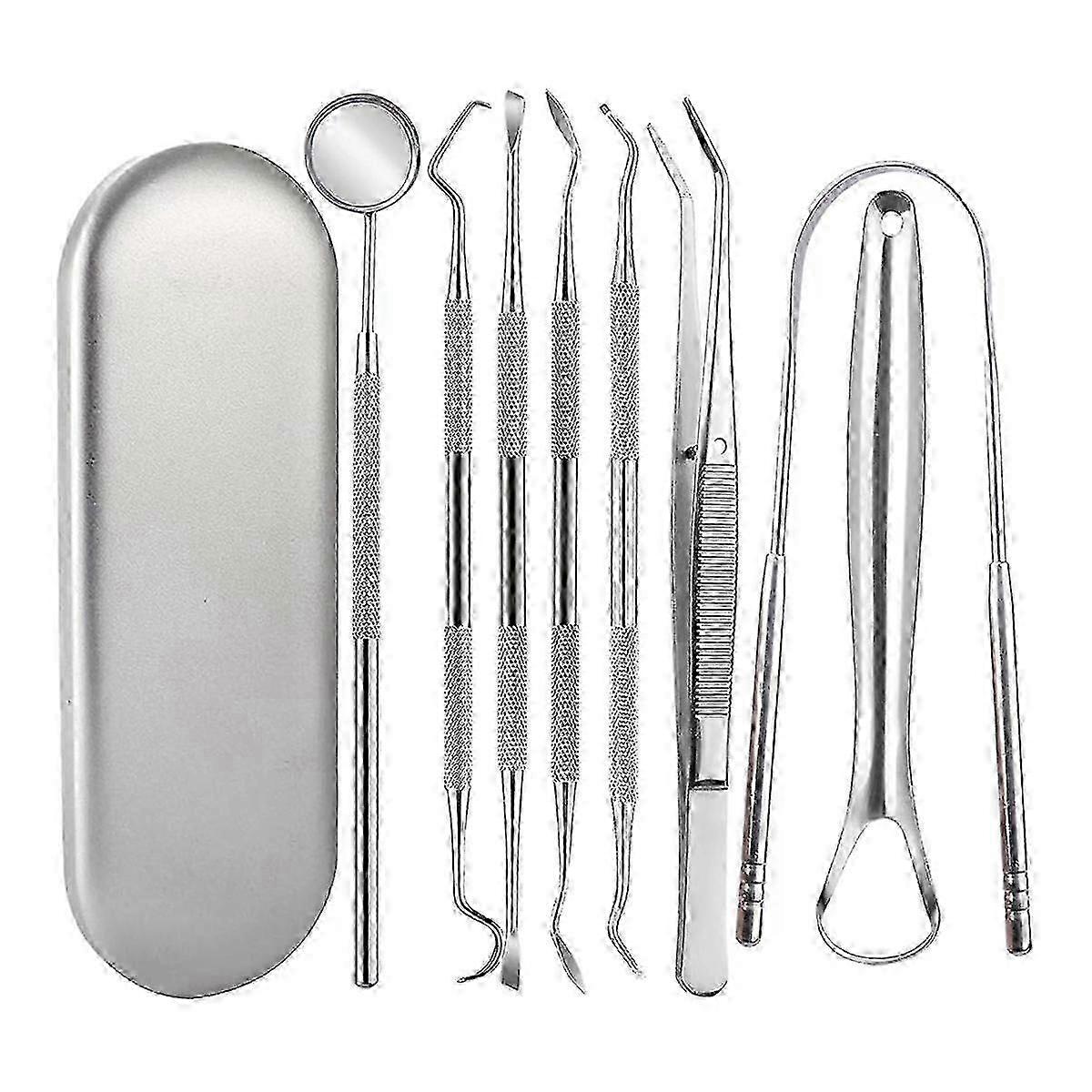 [High -quality dental tool] Made of high -quality stainless steel, durable, high safety, easy to clean and use.Dental tools with different functions can meet different teeth clean needs. [Deep Cleaning] This tooth care kit can effectively help remove plague, tartar, dental, debris, and debris in the tooth and gums, remove food particles between teeth, and fight gingivitis.Use the tongue scraper to help solve the problem of bad breath and make you more confident. [Unique Design] This oral care suit is designed with different angles and shapes, with a mirror, allowing you to clearly see the oral cavity. It is suitable for deep cleaning in the oral area that is difficult to touch in different areas or difficult to touch to maintain the health of the teeth.The non -slipproof handle can improve the stability of the operation and easy to use. [Wide application] This dental tool kit is suitable for dentists, adults, and pet cats and dogs.With this protective cover, you are very convenient to carry and store, and it is also suitable for travel. [You will get] 8 packs professional dental tools; 1 pack finishing box.The most complete dental tool kit provides deep tooth cleaning and oral care, allowing you to easily and quickly care for your teeth! Product Details: Product name: 8-piece dental tool set Material: Aluminum alloy Color: as shown Suitable for: Dentist, Home, Pets. Function: Take good care of your teeth. Package Contents: 8 Pack Dental Tools 1 pack finishing box Usage warning: 1. Please keep it out of the reach of children after each use. 2. Clean tools with hot water before and after each use. Only the above package content, other products are not included. Note: Light reflection and different displays may cause the color of the item in the picture a little different from the real thing. The measurement allowed error is +/- 1-3cm. Note: Due to the light and screen setting difference, the item's color may be slightly different from the pictures. Please allow slight dimension difference due to different manual measurement.