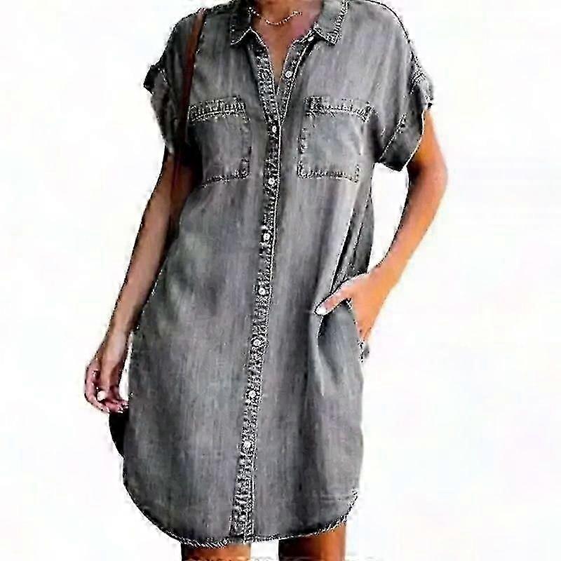 Summer Women Denim Shirt Dress - Casual Short Sleeve A-Line Tunic | V-Neck, Size S, Solid Grey Denim | Lightweight & Breathable Summer Essential