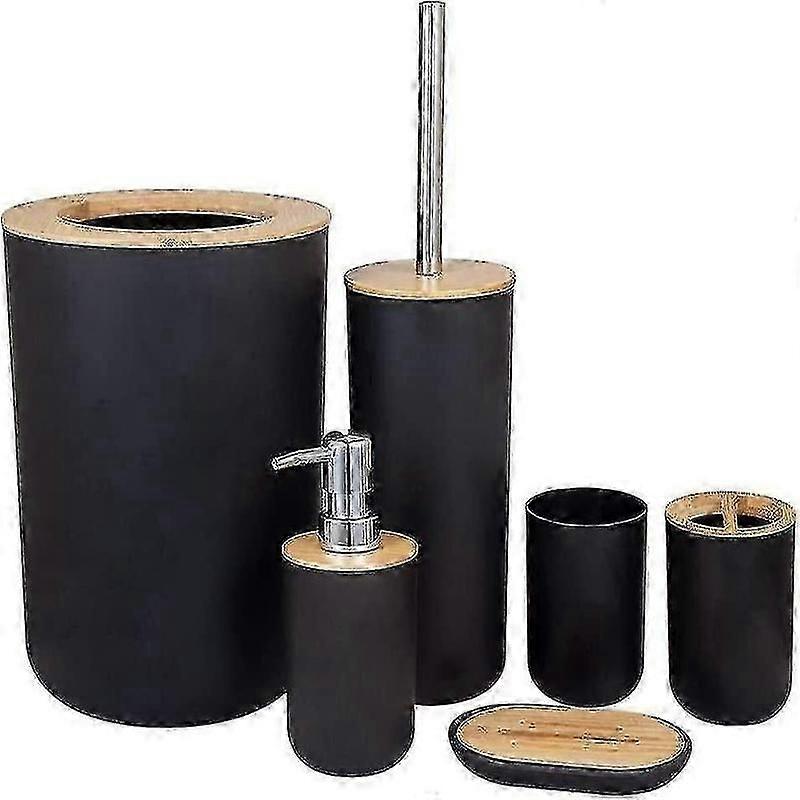 Material: Made of bamboo wood and material, eco-friendly and odorless, durable to use. Bathroom accessories: including trash can, toilet brush, toothbrush holder, scented soap dish, dispensing bottle and cup, which can meet your different needs. Characters: The bin has a large capacity, the toothbrush holder has 2 slots for storage and the dispensing bottle is easy to squeeze. Cleaning tool: The toilet brush has a long handle for easy grip and will keep you from messes. Application: can be used for living room, bathroom and kitchen, also can be used in hotel . Number of shipments:6 pcs