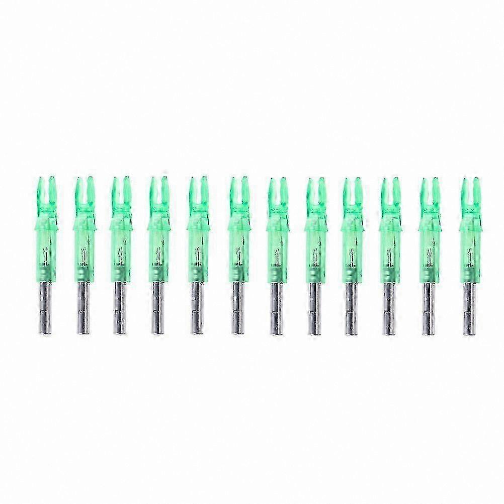 These LED lighted arrow nocks are made of durable ABS material. They provide illumination for over 48 hours on a single battery charge. Designed to fit arrow shafts with an internal diameter of 6.2 mm. Batteries are installed but not activated at the time of shipment for safety. Features - Color: Green - Material: ABS - Dimensions: Approximately 5 x 0.8 x 0.8 cm - Continuous operation for over 48 hours, enabling easy arrow tracking in low-light or daytime conditions - No external on/off switch - Waterproof and impact-resistant for reliable performance - Easy to install and remove Package Includes: 12 x Lighted Arrow Nocks