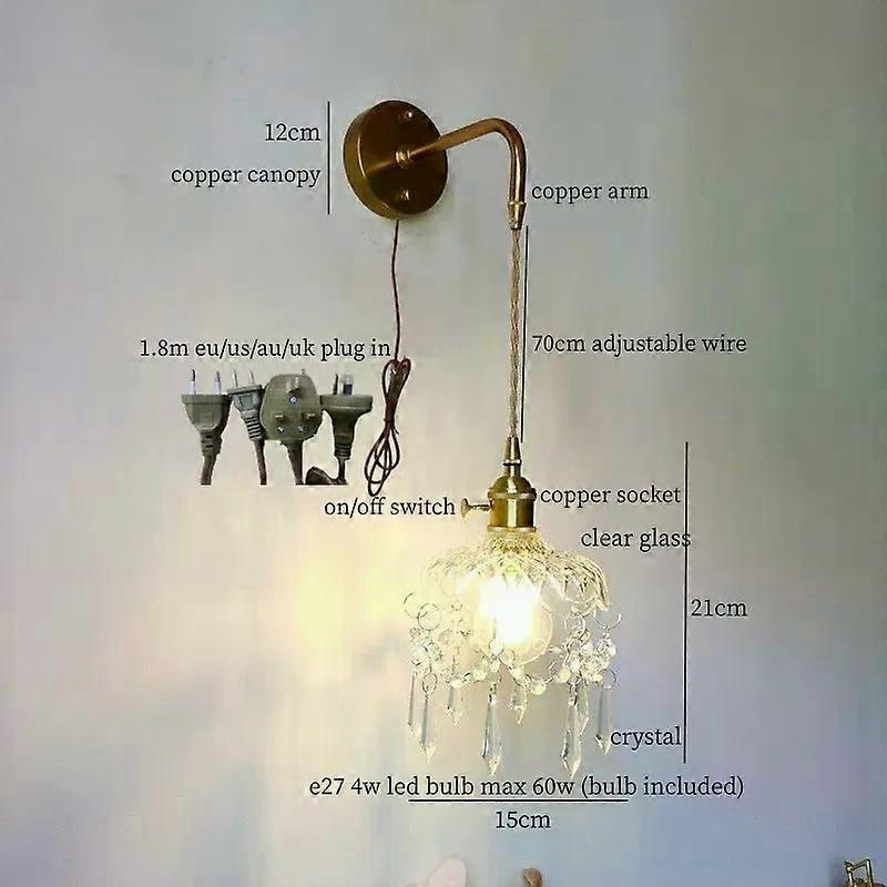 Specifications Luminous Flux:249-2000 High-concerned chemical:None Installation Method:self-contained Color:WHITE is_customized:Yes Is Smart Device:No Features:Glass Model Number:W100-7 Lighting Area:5-10square meters Application:Kitchen,Dining Room,Bed Room,Foyer,Study,Bathroom Technics:Plated Number of light sources:1 Material:Copper Warranty:5 years Shade Type:Clear Glass Shade Direction:Up & Down Base Type:E27 Power Source:AC Is Bulbs Included:No Item Type:Wall Lamps Origin:China Certification:CCC,ce,CQC,EMC,FCC,GS,LVD,pse,SAA,UL,VDE,EAC Light Source:LED Installation Type:Wall Mounted Brand Name: Is Dimmable:No Switch Type:Knob switch Body Material:Glass Style:Europe Voltage:90 - 260 V Use:Daily Lighting Dropshipping:Support Dropshipping Base Size:12CM Bulb:Bulb Included Bulb Wattage:4W(Max 60W) Pull Chain Switch:Pull Chain Switch Included Lampshade Material:Glass About the lamp,it's warranty is 4 years! We Support Dropshipping ,welcome To Contact Us! Specifications Light Information Type Wall Light Features 70CM Adjustable Wire Style Nordic/Minimalism/French Vintage Finish Others Dimensions Overall Height The pictures shows Overall Width The pictures shows Overall Depth The pictures shows Bulb Information Number of Bulbs 1 Bulb Base E27 Wattage per Bulb 4W(Max:60W) Bulb Included Yes Material Fixture Material Copper Shade Material Glass/Crystal Weight Net Weight(kg) 1.32kg There are more lamps in my store ,welcome to have a look! Size Instruction What our customers say: Why Buy From Us Safty Insurance