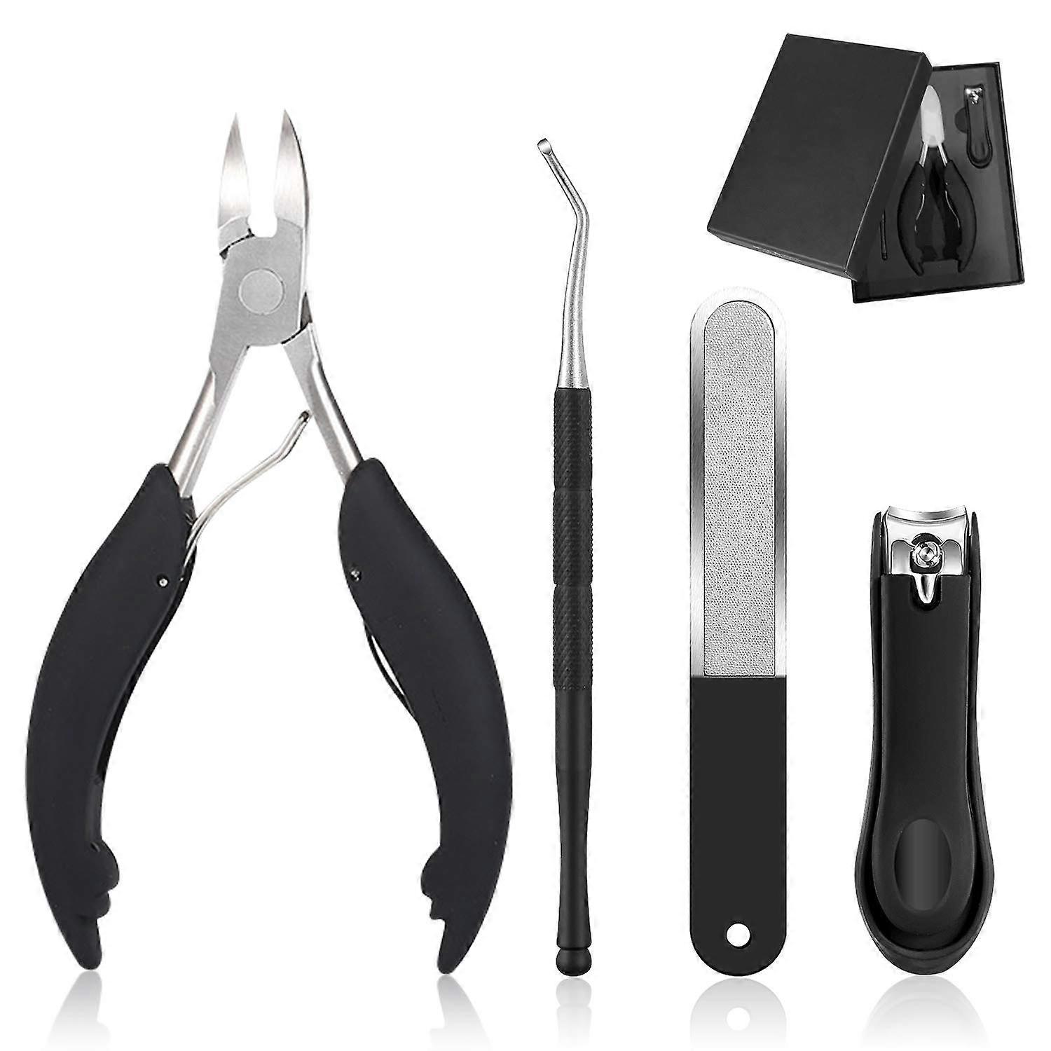 Product overview A complete fourpiece nail care kit designed for precise trimming and clean finishing of fingernails and toenails, especially suited for thick, irregular, or ingrown nails. The set provides tools for trimming, lifting, filing, and finishing to help maintain neat, manageable nails. Key benefits Complete kit for targeted nail work: toenail clipper, nail clipper, nail lifter, and nail file work together to tackle tough or hardtoreach nails. Precise, controlled cutting: sharp blades and a dedicated toenail clipper reduce the force needed to trim thicker nails for cleaner results. Safer handling: the nail lifter helps expose trapped or tight edges before trimming, making clipping easier and more controlled. Clean finishing: the included nail file smooths edges after clipping for a tidy appearance. What is included 1 toenail clipper 1 nail clipper 1 nail file 1 nail lifter How it performs Designed for trimming and shaping thicker or irregular nails as well as routine nail maintenance. Sharp cutting edges provide accurate trimming while the lifter and file assist with preparation and finishing. Compact kit format supports home use and travel. Use scenarios After a long period without a pedicure, use the toenail clipper to carefully shorten and reshape thick toenails, then finish with the file. If an edge of a nail has grown inward or become trapped, use the nail lifter to gently raise the edge and create space for a safe, controlled trim. For regular grooming, use the nail clipper for fingernails and the file for smoothing and shaping for a neat look. Care and storage Keep tools in the included box or pouch when not in use. Store in a cool, dry place away from humidity, dust, chemicals, acidic substances, and cosmetics. Regularly wipe the blades with a soft cloth and apply a thin coating of oil to the metal. Avoid cutting tape, adhesive materials, or other sticky substances that can leave residue on the blades and affect cutting performance. Clean any residue promptly with a soft oiled cloth. Safety and proper use Keep out of reach of children. Tools are designed for nail care only. Do not use to cut wires, plastic, staples, cardboard, or other nonnail materials. Handle blades carefully; keep tools stored safely after each use to avoid accidents. This kit provides the essential handheld tools for focused nail maintenance and finishing when dealing with thicker, irregular, or hardtoreach nails.