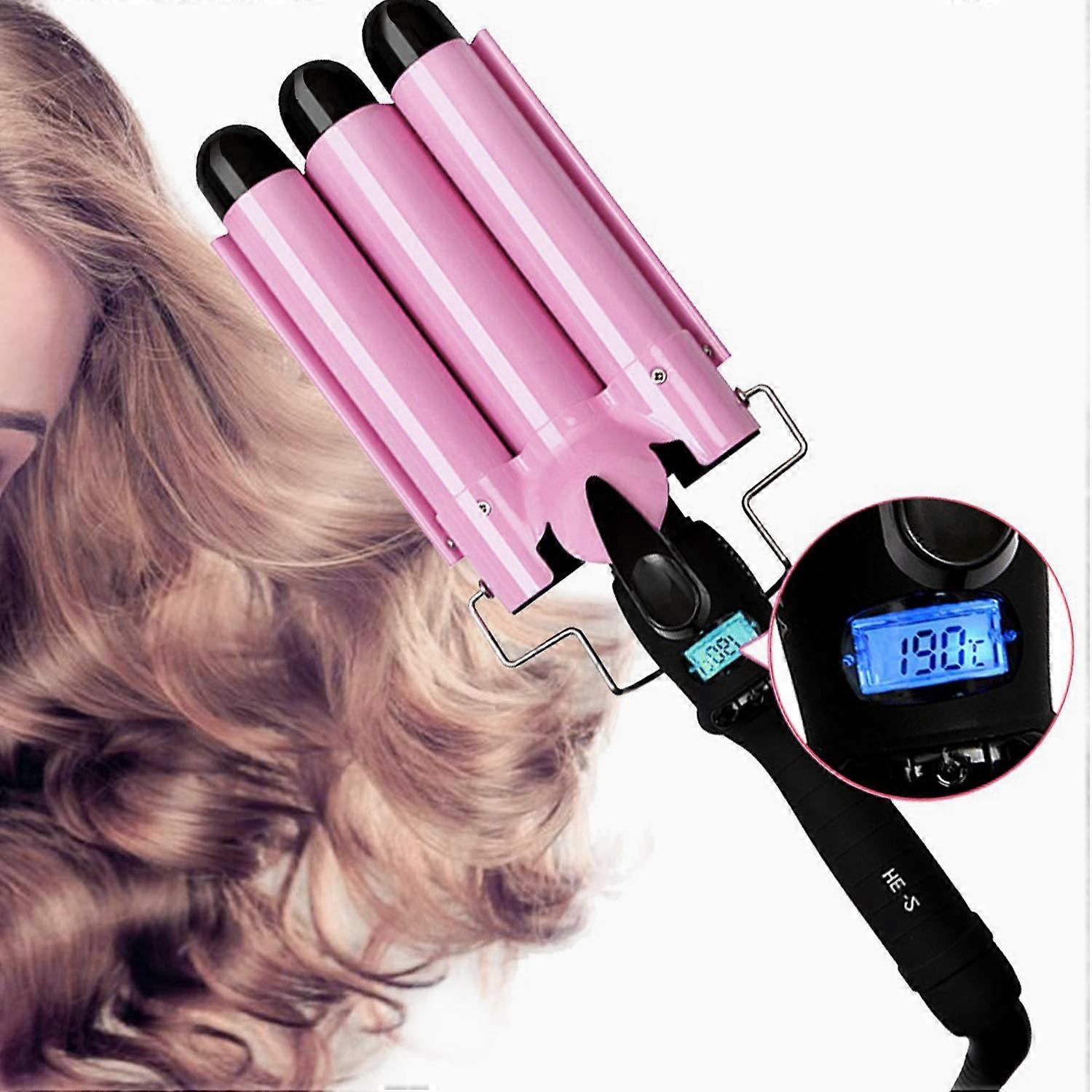 25mm Triple Barrel Curling Iron Ceramic Tourmaline Hair Waver with LCD Temperature Control Pink