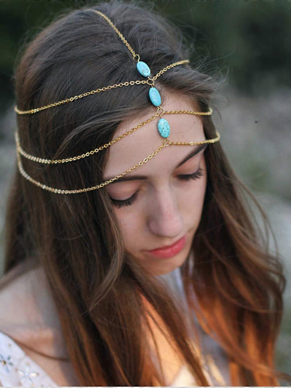 Turquoise Headpiece with Gold Plated Finish, Bohemian Gypsy Forehead Head Chain, Adjustable Fit