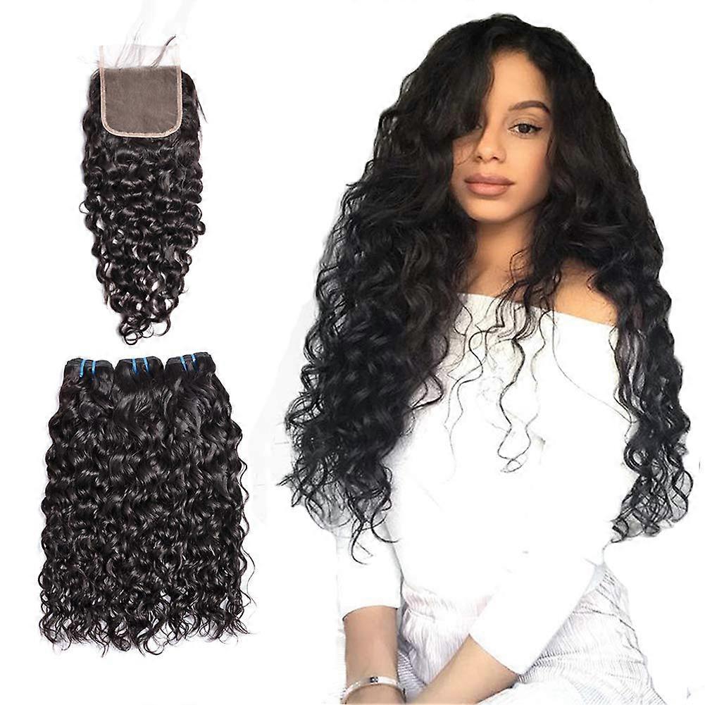 Brazilian Water Wave Human Hair Bundles with Closure 9A Grade Natural Black Wet and Wavy