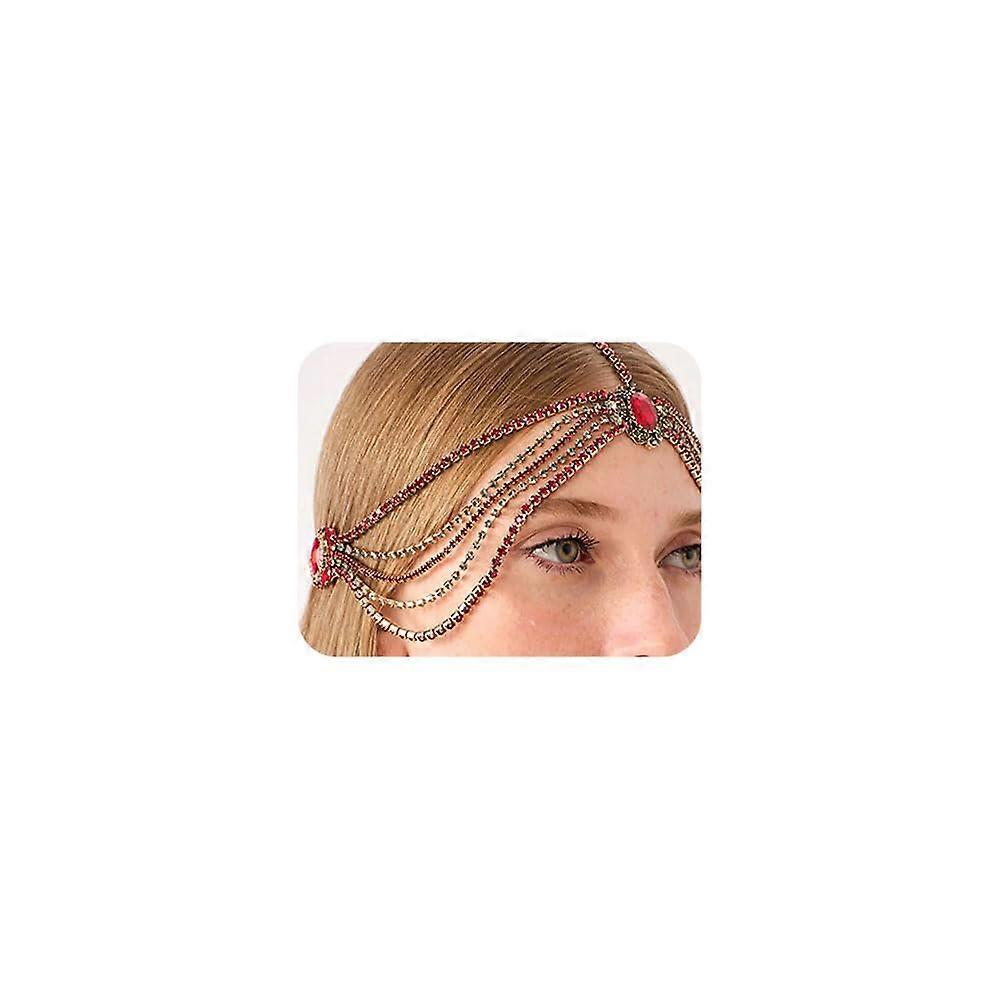 Gold Plated Bridal Head Chain with Green and Red Crystals, Rhinestone Wedding Headpiece for Women